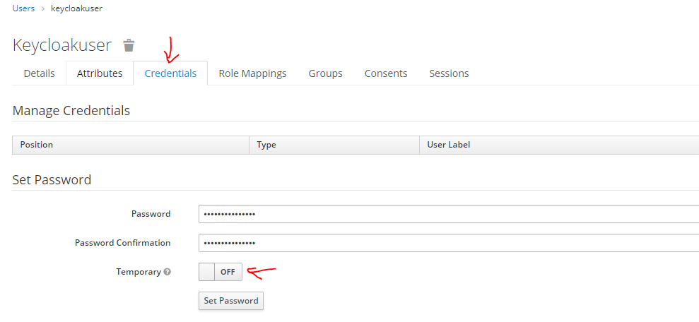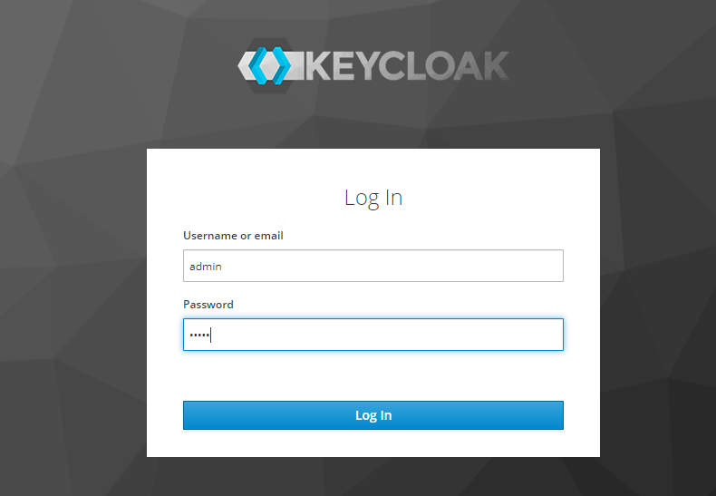 In our case, user and admin password is admin, as we passed to container as environmental variables: KEYCLOAK_USER and KEYCLOAK_PASSWORD above.