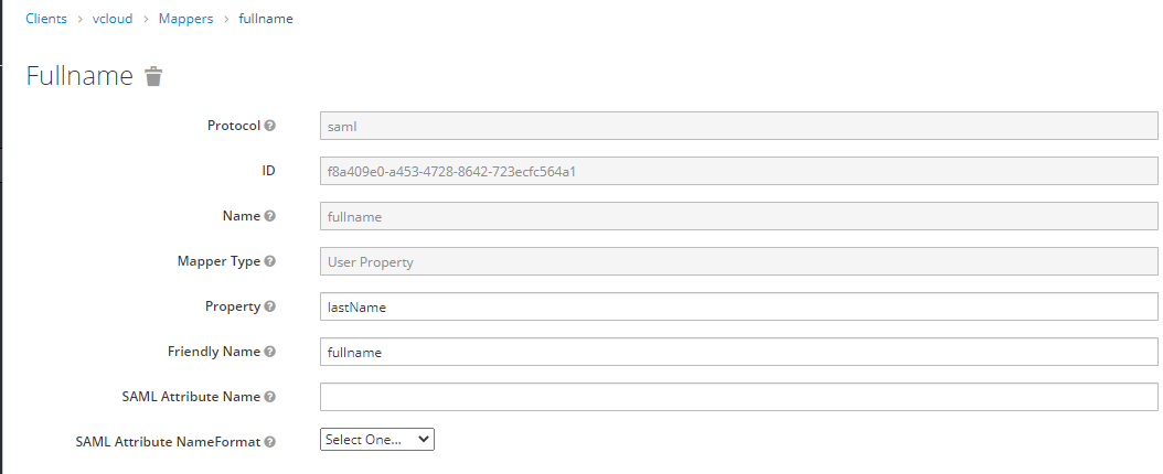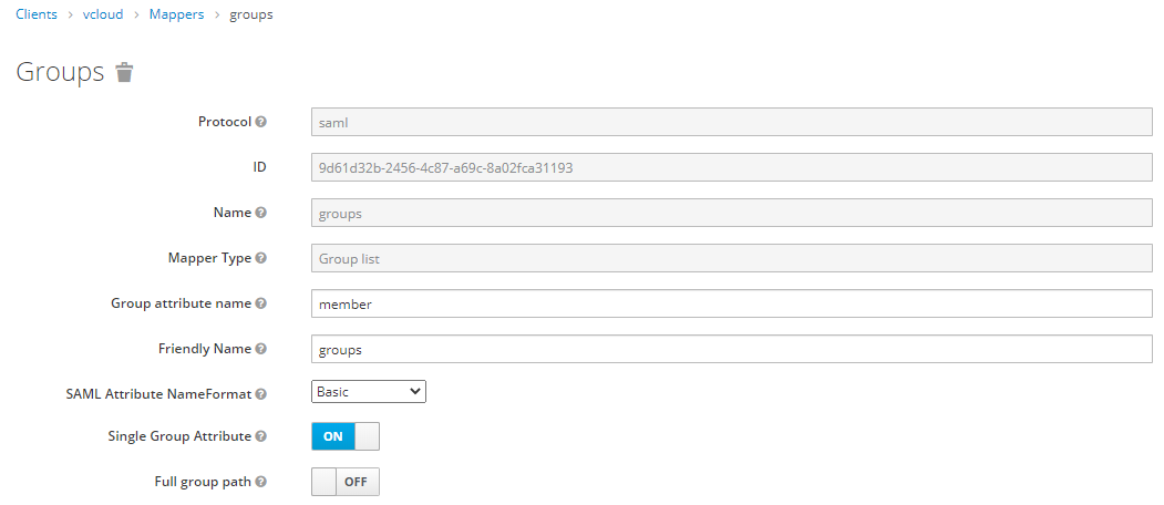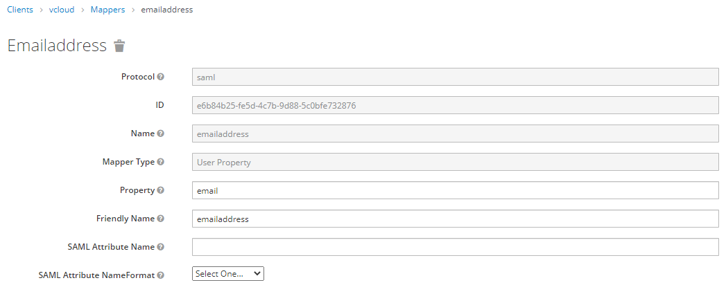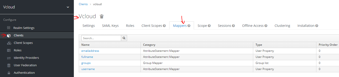 If Keycloak should pass some attributes within SAML token to vCloud we must define Mappers for our client, we defined earlier. Go to client configuration, select Mappers tab and define them: