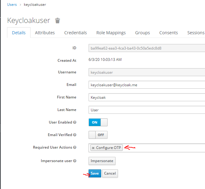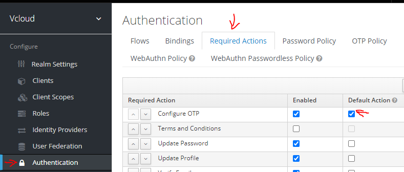 To set up 2FA in Keycloak, we simply need to activate it as Required Action on Realm, simply by activate checkbox Default Action: