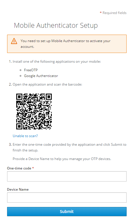 2FA in Keycloak is preconfigured, it is based on OTP and supported by Google Authenticator or FreeOTP, in our case we will be using Google Authenticator android app, download it on your mobile device to complete this step.